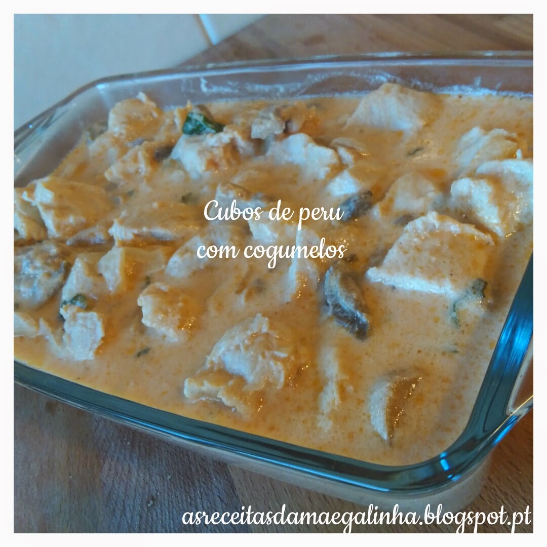 Faça um refogado com o azeite, a cebola e a folha de louro. Junte a polpa de tomate, a mostarda, os cubos de peru, os cogumelos e as natas e deixe cozinhar até a carne estar pronta.